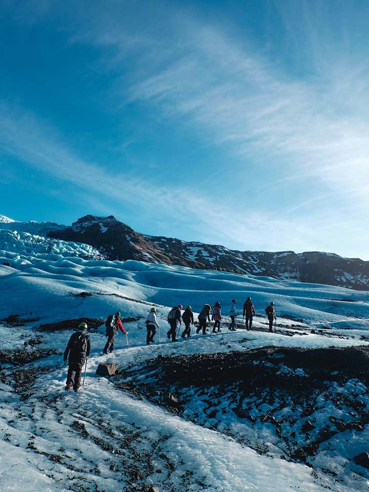 Desayuno. Emprendemos camino por la costa sur, una de las zonas más espectaculares del país. Parada en Seljalandsfoss, con opción de caminar por detrás de la cascada, y continuación hasta Skógafoss. Paseo por la playa de arena negra de Vik. Alojamiento en hotel en la zona del glaciar Vatnajökull (2 noches).Día 4 Glaciar Vatnajökull