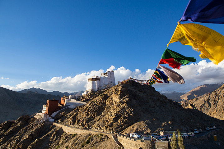 Traslado al aeropuerto y vuelo a Leh (3.500 m). Llegada al aeropuerto de Leh, donde nuestro representante os recibirá y trasladará al hotel. Este vuelo es uno de los más espectaculares del mundo: en un día despejado, desde un lado del avión pueden verse a lo lejos las cumbres del K2, Nanga Parbat y Gasherbrum, y del otro lado, tan cerca que parece que podrías tocarlas, se encuentra el macizo Nun Kun. Tomaréis un tiempo para instalaros y aclimataros, ya que habréis pasado de una altitud relativamente baja en Nueva Delhi a gran altura. Día libre para aclimatación y paseo por el mercado por la tarde. Alojamiento en hotel.Día 3 – Leh. Visitas a Shey – Thinksey – Hemis